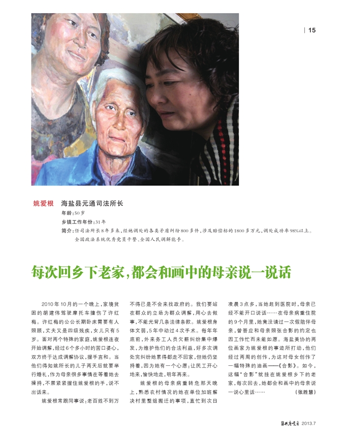 姚爱根的母亲病重转危那天晚上,熟悉农村情况的她在单位加班解决村里整组搬迁的事项,直忙到次日凌晨3点多,当她赶到医院时,母亲已经不能开口说话……在母亲病重住院的9个月里,她竟没请过一次假陪伴母亲,曾答应和母亲照张合影的约定也因工作忙而未能如愿。海盐美协的两位画家为姚爱根的事迹所打动,他们经过两周的创作,为这对母女创作了一幅特殊的油画——《合影》。如今,这幅“合影”就挂在姚爱根乡下的老家,每次回去,她都会和画中的母亲说一说心里话…… (张胜慧)
