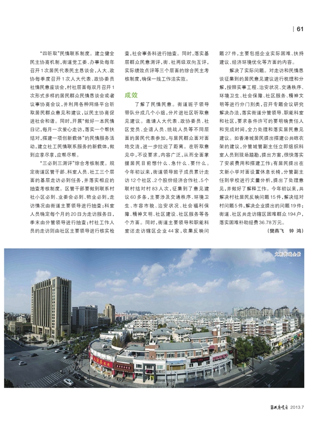 “四听取”民情联系制度。建立健全民主协商机制,街道党工委、办事处每年召开1次居民代表民主恳谈会,人大、政协每季度召开1次人大代表、政协委员社情民意座谈会,村社层面每双月召开1次形式多样的居民群众民情恳谈会或者议事协商会议,并利用各种网络平台听取居民群众意见和建议,以民主协商促进社会和谐。同时,开展“做好一本民情日记,每月一次爱心走访,落实一个帮扶结对,搭建一项创新载体”的民情服务活动,建立社工民情联系服务的新载体,做到应享尽享,应帮尽帮。