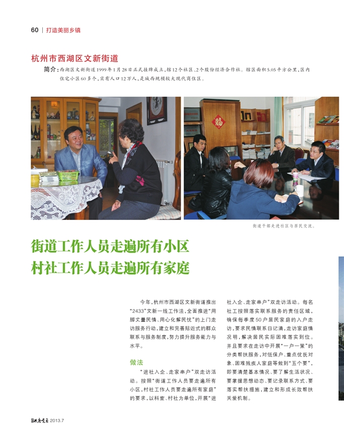 今年,杭州市西湖区文新街道推出“2433”文新一线工作法,全面推进“用脚丈量民情、用心化解民忧”的上门走访服务行动,建立和完善贴近式的群众联系与服务制度,努力提升服务能力与水平。