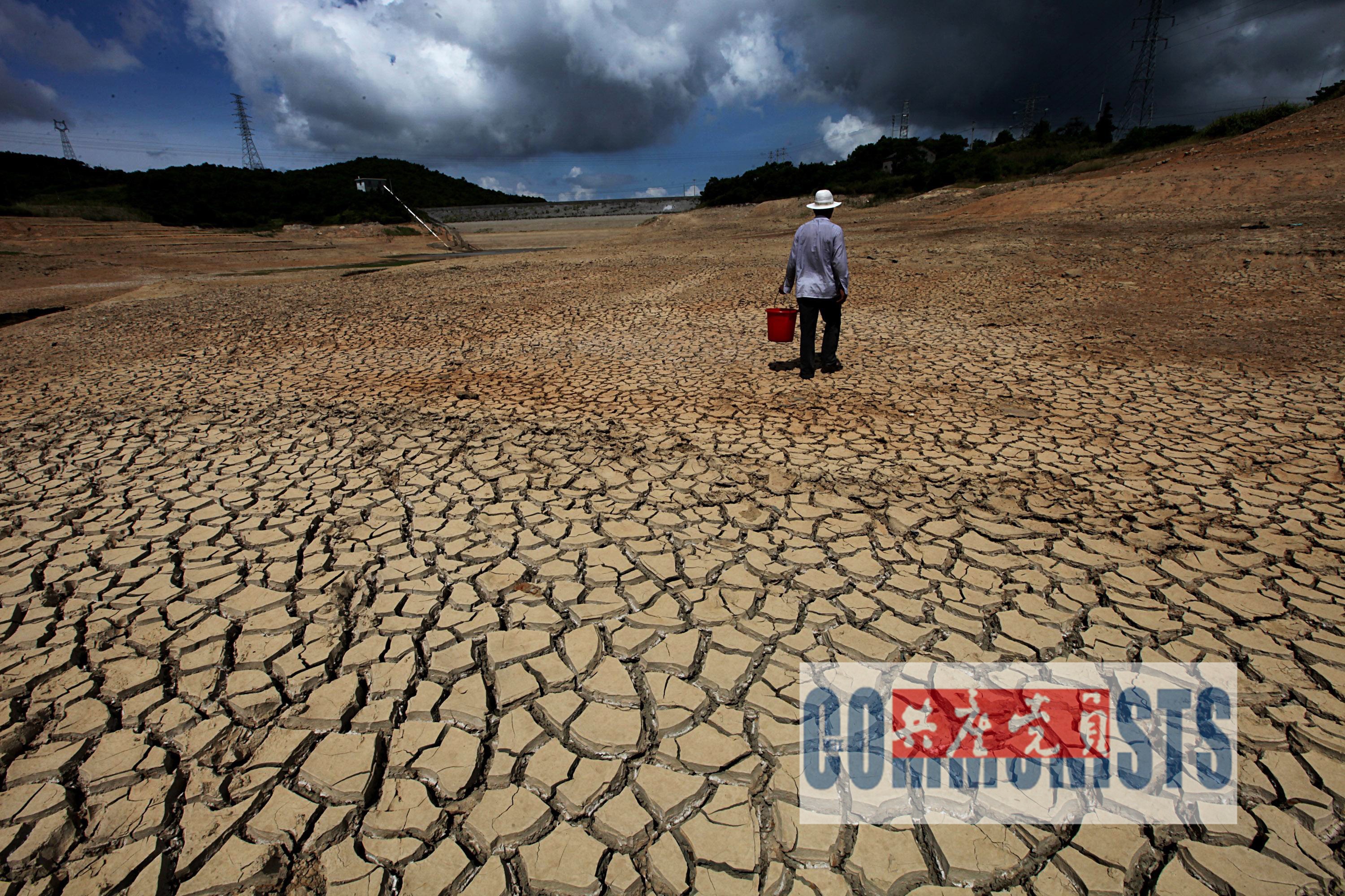 8月18日,玉环县杨家村的牛栏水库库底已大片龟裂,一村民提着水桶在舀水。牛栏水库是鲜迭片区域内海拔最高的水库,能容纳20多万立方米水,山上村民的生活用水大多来自于此。/孙金标