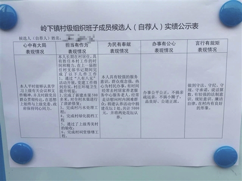 制定出台《岭下镇村干部选前实绩考核办法》,从“心中有大局、担当有作为、为民有奉献、办事有公心、言行有规矩”五个方面设计实绩公示内容,226名村党支部委员候选人结合自身填写《实绩测评表》,统一在各村三务公开栏内公示三天,接受群众检验,让群众对候选人的成绩和本领“一目了然”。
