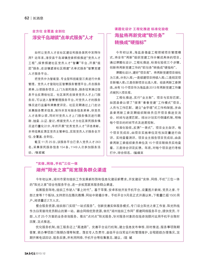 湖州“阳光之家”拓宽服务群众......海盐将两新党建“软任务” 转......淳安千岛湖镇“点单式服务”人......