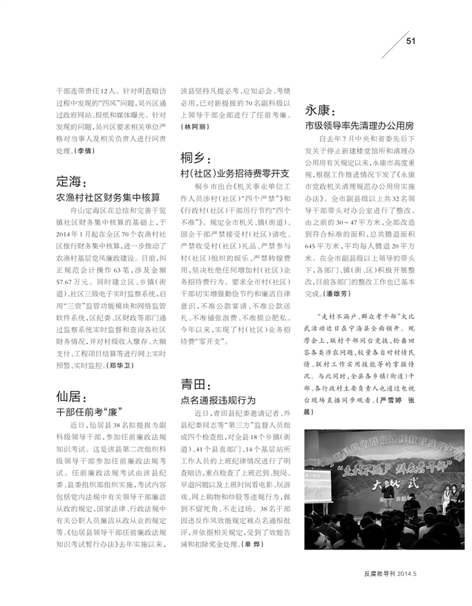 前沿桐乡:村(社区)业务招待费零......永康:市级领导率先清理办公用......定海:农渔村社区财务集中核算青田:点名通报违规行为仙居:干部任前考“廉”