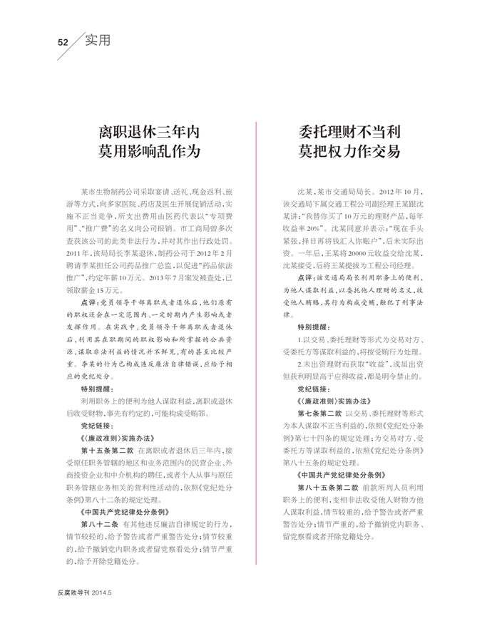 离职退休三年内 莫用影响乱作......委托理财不当利 莫把权力作交......