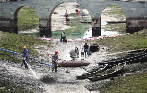 5月13日,绍兴市上虞区东关街道担山村担山江汛前忙清淤。担山村的水域面积超过200多亩,是省水利厅建设生态河道的一个试点,给这条已经十多年没有清淤的河道净身,汛期更安全。王丽红摄 作者单位:绍兴日报社