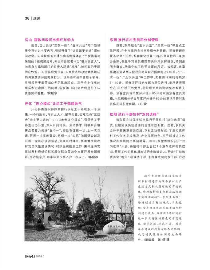 日前,东阳结合“五水共治”、“三改一拆”等重点工作开展,在全市推行农村党员积分制管理。积分管理设置基础分100分,配套量化设置13条扣分条款和6条加分条款,侧重于对党员模范带头作用发挥情况,特别是服务群众、助推中心工作等方面的考评。如规定,违章搭建被查处而未按规定时限自行拆除的,扣40分;在“三改一拆”、“五水共治”等工作中,起重要作用的每项加5~10分。积分考评以党支部为单位进行,季度通报积分在60分以下的党员,将组织关系转到镇整改帮教支部。预备党员当年度评分低于85分的取消预备党员资格,入党积极分子当年度评分低于85分的取消考察对象资格或延长考察期。/王 雷