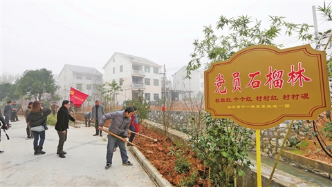 “红石榴工程”全面铺开 2015年12月8日,浦江县基层党建“红石榴工程”全面铺开。第一批总计2000株石榴树苗在15个乡镇街道扎根。本次红石榴的种植采取1+1形式:前一个“1”是县委选择30个党建全面过硬的村作为第一批种植范围,按照每个村的党员数分发石榴树,一人一株,连片种植创风景,并标注党员石榴林标牌;后一个“1”是每位党员自购一株,在自己联系群众户的门口种植,每株石榴树上挂党员认领牌,由该名党员和联系户负责种植管理,责任到人。/吴小杭 应旭光 摄 作者单位:浦江县委组织部