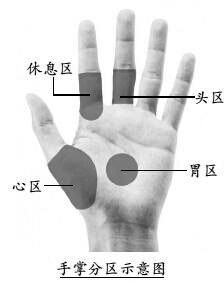 气色形态手诊的主要分区包括心区、头区、胃区和休息区,心区分布在手掌的大鱼际处,通过该区发紫、血丝等表现,可以反映心烦、心慌、冠心病等病症;头区分布在中指近手掌的这一节指节,偏头痛、脑中风患者往往可以在此处观察到青筋等病理表现;胃区是位于掌心的一个圆形区域,胃区如果出现白色、红色、褐色,就要格外注意胃部健康了;休息区位于食指靠手掌一节的内侧面及该段下方,具体又分为失眠区、多梦区、疲劳困乏区等,主要是通过看颜色来判断睡眠状况。