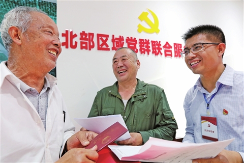 党群联合服务中心 乐清市为解决偏远山区“空心村”党建难题,在山区人口集中流入地或移民聚居点的大荆镇等地,建立跨乡镇、跨村的联合党支部和党群联合服务中心,既为山区群众提供便利服务,又解决党员的教育学习管理问题。图为乐清市大荆镇“北部区域党群联合服务中心”党员志愿者为山区群众全程代办低保手续。/李金见摄 作者单位:乐清市委组织部