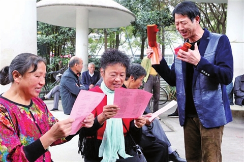 宣讲六中全会精神 11月21日上午,台州市路桥区路桥街道退休干部毛国平(右)带着自己新创作的十八届六中全会精神宣讲文艺作品,专门在广场公园进行表演并征求群众意见,力求使作品通俗易懂,为群众所喜闻乐见。/王依友摄 作者单位:台州路桥区委报道组