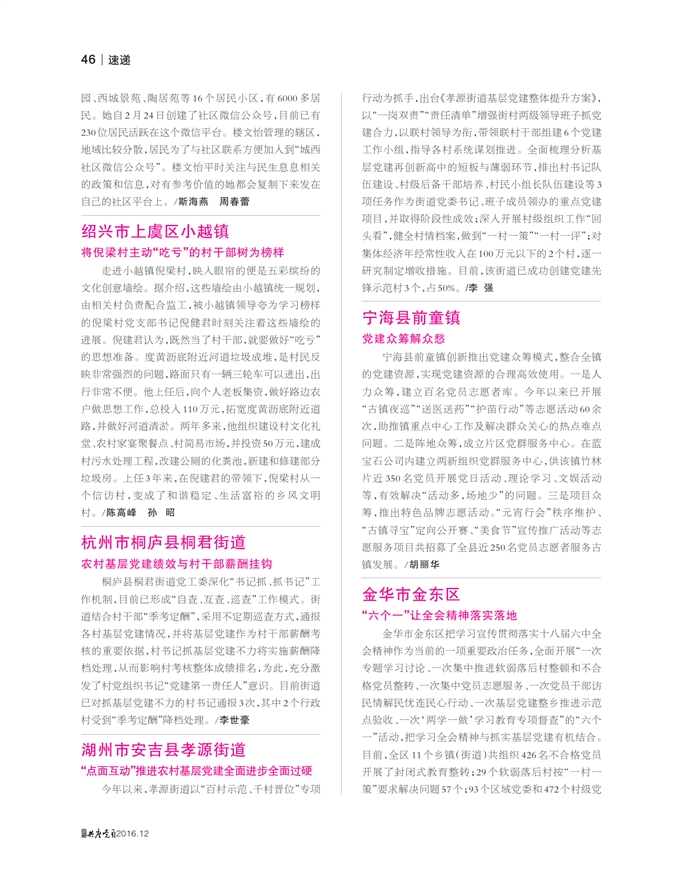 绍兴市上虞区小越镇 将倪梁村......宁海县前童镇 党建众筹解众愁金华市金东区 “六个一”让全......杭州市桐庐县桐君街道 农村基......湖州市安吉县孝源街道 “点面......