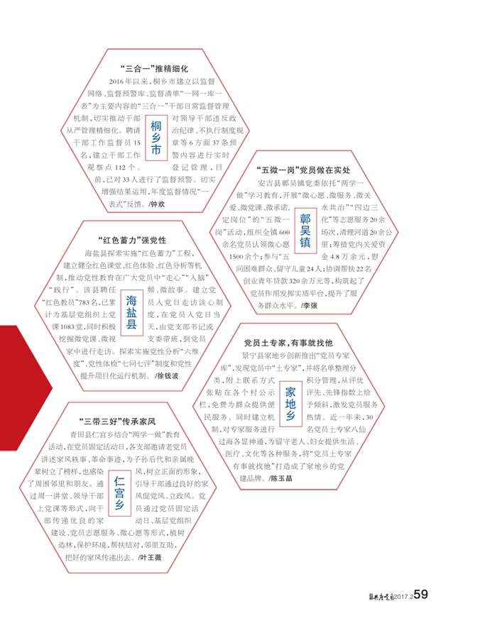 桐乡市 “三合一”推精细化鄣吴镇 “五微一岗”党员做在......海盐县 “红色蓄力”强党性家地乡 党员土专家,有事就找......仁宫乡 “三带三好”传承家风