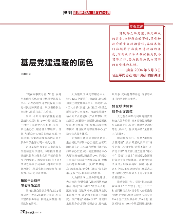 这只是湖州市委大力推进服务型基层党组织建设,不断提升基层党组织服务功能和党员干部的服务水平的缩影。围绕着2004年6月3日习近平同志的讲话,湖州市委以此为指引,基层党组织的凝聚力、影响力、号召力显著增强。