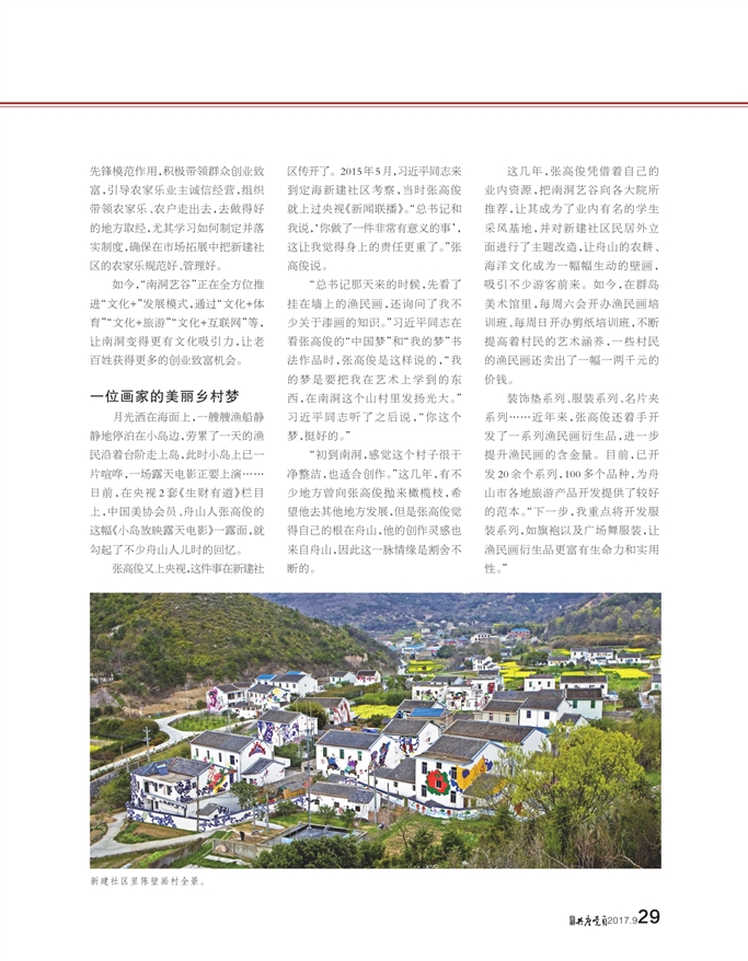 这几年,张高俊凭借着自己的业内资源,把南洞艺谷向各大院所推荐,让其成为了业内有名的学生采风基地,并对新建社区民居外立面进行了主题改造,让舟山的农耕、海洋文化成为一幅幅生动的壁画,吸引不少游客前来。如今,在群岛美术馆里,每周六会开办渔民画培训班、每周日开办剪纸培训班,不断提高着村民的艺术涵养,一些村民的渔民画还卖出了一幅一两千元的价钱。