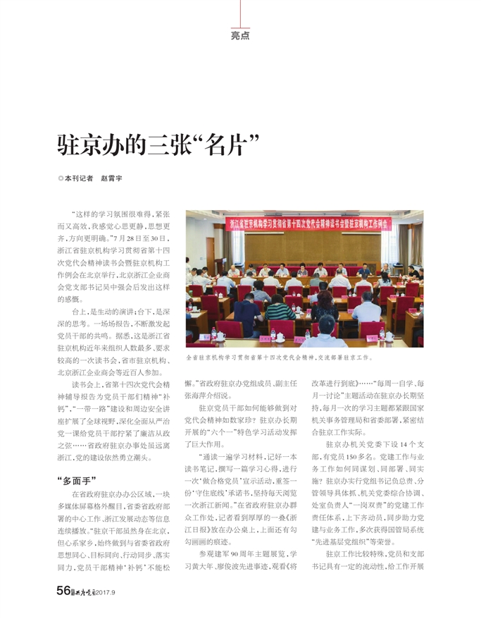 “这样的学习氛围很难得,紧张而又高效,我感觉心思更静,思想更齐,方向更明确。”7月28日至30日,浙江省驻京机构学习贯彻省第十四次党代会精神读书会暨驻京机构工作例会在北京举行,北京浙江企业商会党支部书记吴中强会后发出这样的感慨。