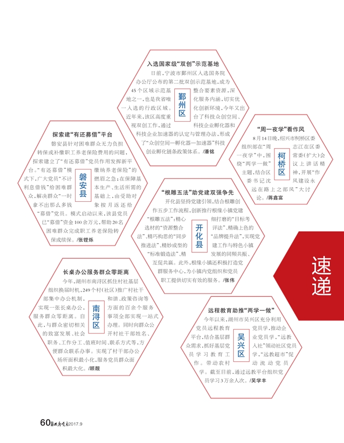 鄞州区 入选国家级“双创”示......磐安县 探索建“有还募借”平......开化县 “根雕五法”助党建双......南浔区 长桌办公服务群众零距......吴兴区 远程教育助推“两学一......柯桥区 “周一夜学”看作风