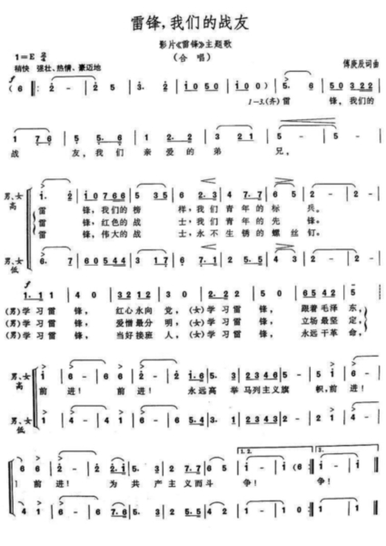 1958年6月7日 如果你是一滴水,你是否滋润了一寸土地?如果你是一线阳光,你是否照亮了一分黑暗?如果你是一颗粮食,你是否哺育了有用的生命?如果你是一颗最小的螺丝钉,你是否永远坚守在你生活的岗位上?如果你要告诉我们什么思想,你是否在日夜宣扬那最美丽的理想?你既然活着,你又是否为未来的人类的生活付出你的劳动,使世界一天天变得更美丽?我想问你,为未来带来了什么?在生活的仓库里,我们不应该只是个无穷尽的支付者。 1960年6月5日 要记住:“在工作上,要向积极性最高的同志看齐;在生活上,要向水平最低的同志看齐。” 1960年10月21日 我要牢牢记住这段名言:“对待同志要像春天般的温暖,对待工作要像夏天一样火热,对待个人主义要像秋风扫落叶一样,对待敌人要像严冬一样残酷无情。” 1961年10月20日 人的生命是有限的,可是,为人民服务是无限的,我要把有限的生命,投入到无限的“为人民服务”之中去…… 1962年4月17日 一个人的作用,对于革命事业来说,就如一架机器上的一颗螺丝钉。机器由于有许许多多的螺丝钉的连接和固定,才成了一个坚实的整体,才能够运转自如,发挥它巨大的工作能力。螺丝钉虽小,其作用是不可估计的。我愿永远做一个螺丝钉。螺丝钉要经常保养和清洗,才不会生锈。人的思想也是这样,要经常检查,才不会出毛病。 雷锋“情书” “小凌:给你写信的此刻,已经是深夜一点钟,我刚上完晚班回家,今夜整整忙了4个钟点,我真是很疲倦了。我拧亮台灯,坐下来给你写信,疲倦就立刻飞去了。宿舍里的人都已入睡。窗外繁星满天,明亮的月光从外射了进来。在窗内还可以看到田野里成熟的高粱、玉米、稻谷在随风摆动,好像在向我点头,在向我微笑,它们都好像要陪我给你写信似的。我是多么愉快呀,真是高兴极了。我相信你也会感到如此的兴奋,我有不知多少话要跟你说,却不知从何说起,谈话并没中止,写到这里告一段落。1958年6月” 这是雷锋写给女友小凌的信。雷锋一生有过3个最敬慕、最爱慕的女性。 1964年电影《雷锋》剧照。六十年代流行的雷锋宣传画。2009年,在电视剧《雷锋》中“跳水王子”田亮饰演雷锋。街上流行雷锋帽。日前,一对青年男女戴着厚实的雷锋帽在天安门前留影。